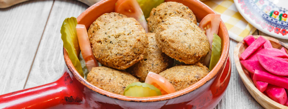 Garbanzo & Fava Bean Fritters / Spices / Sesame Seeds / Shredded Iceberg / Tomato / Tahini